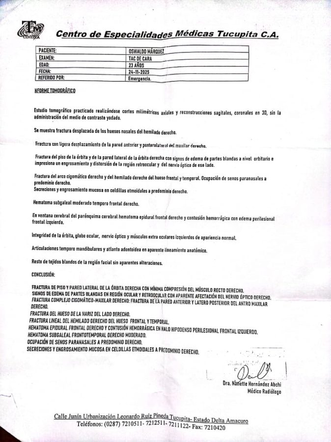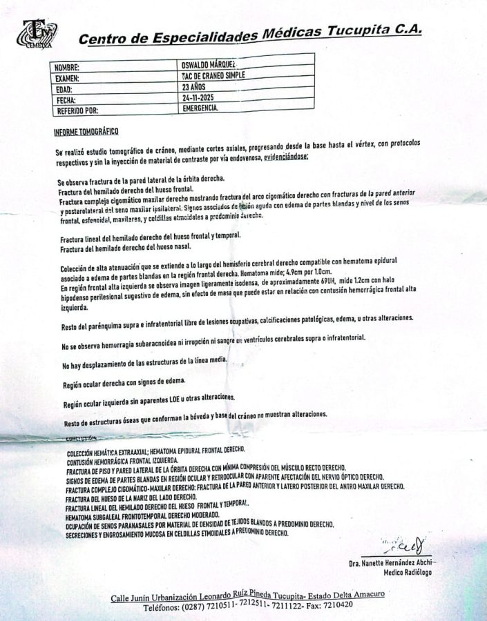 Márquez explicó que su hermano necesita una intervención quirúrgica urgente debido a las fracturas que sufrió tras recibir una golpiza el pasado 17 de noviembre por parte de un grupo de personas en el vertedero.